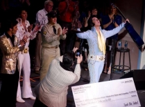 Zu Ende gegangen ist am gestrigen Sonntag, dem 9. Juni 2013, das viertägige „Tupelo Elvis Festival“ in Elvis Presleys Geburtsstadt Tupelo/Mississippi, das in diesem Jahr bereits zum fünfzehnten Mal stattgefunden hat und das schon aufgrund seines historischen Ortes die vielleicht wichtigste Elvis-Großveranstaltung eines jeden Jahres nach den Events „Elvis Week“ und „Elvis Birthday Celebration“ von Elvis Presley Enterprises (EPE) in Memphis ist. Nach den gelungenen ersten beiden Tagen des „Tupelo Elvis Festival 2013“ (s. unseren Bericht von vorgestern) gehörte an den beiden letzten Tagen des Events der Auftritt von Elvis’ früherem Begleitsänger Joe Moscheo von „Elvis’ Imperials“ zu den Highlights des Festivals. Moscheo war zwar ohne seine „Imperials“-Kollegen nach Tupelo gekommen, gehörte dort aber als zweiter originaler Elvis-Weggefährte neben Schlagzeuger D. J. Fontana naturgemäß zu den Stars des Festivals, und sein Konzert mit Elvis-Imitator Shawn Klush und dem „Blackwood Quartet“ (oberes Foto: die Künstler bei der Fahrt zum Auftritt) erhielt Ovationen der Fans. Große Freude bereiteten den Besuchern aber auch die Darbietungen des ortsansässigen Chores „The Tupelo Unity Choir“, der einst von Elvis gesungene Gospels und Spirituals vortrug (mittleres Foto: der Chor mit Band auf der Bühne). Den Elvis-Imitatoren-Wettbewerb als weitere Vorrunde zum „Ultimate Elvis Tribute Artist Contest“ von Elvis Presley Enterprises (EPE) gewann Jay Dupuis vor Jeff Lewis und Brycen Katolinski (unteres Foto: Jubel des Gewinners bei der Siegerehrung). Dupuis durfte sich über stolze 3500,- Dollar Siegprämie und die Qualifikation für die Endrunde des Contest im Rahmen der nächsten „Elvis Week“ in Memphis freuen. Sehr zufrieden zeigten sich die Initiatoren des „Tupelo Elvis Festival“ nicht nur mit der Stimmung sondern auch mit der Besucherzahl des Events, da man mehrere Tausend Fans an den vier Tagen in Elvis’ Geburtsstadt hatte begrüßen können. Datum: 10. Juni 2013 – Quellen: Tupelo Elvis Festival, Downtown Tupelo Main Street Association |