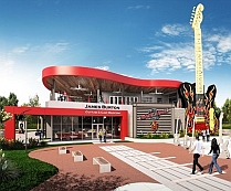 Eine dauerhafte Dokumentation und Würdigung seines eigenen Lebenswerkes, die aber auch dem Musik-Nachwuchs zugute kommen wird, bereitet der schon zu Lebzeiten legendäre Elvis-Leadgitarrist James Burton aus der „TCB Band“ des King vor. In Shreveport/Louisiana, der Heimatstadt des heute 76-jährigen Musikers, ist ein „James Burton Guitar & Car Museum“ in Vorbereitung, das am Ende so aussehen soll wie in nebenstehend abgebildeter Studie. Ausgestellt werden sollen Gitarren, Autos, Bühnenkleidung und andere historische Stücke aus dem Leben und der Karriere des Meistergitarristen. Dazu soll das Museum auch eine Talentschmiede für jugendliche Musikbegeisterte werden, die dort das Gitarrespielen üben und kleine Live-Auftritte absolvieren werden können. Träger des Museums wird die „James Burton Foundation“ sein, die sich seit jeher schon um die Förderung junger Musiktalente kümmert. Datum: 10. Juli 2016 – Quelle: James Burton/The James Burton Foundation |