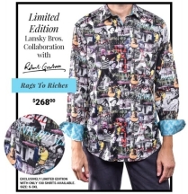 Bei Elvis Presleys Lieblingsmodegeschäft der 50er und 60er Jahre „Lansky Brothers“ in Memphis kann man heute nicht nur klassische Herren- und Damenmode-Artikel erwerben sondern immer wieder auch Nachbildungen historischer Kleidungsstücke, die „Lansky“ seinerzeit für Elvis geschaffen hatte. Dazu präsentiert das berühmte Kult-Geschäft von Zeit zu Zeit auch spezielle Neu-Kreationen mit Elvis-Bezug. Dies ist ganz aktuell wieder einmal der Fall, denn in dieser Woche hat „Lansky Brothers“ das ganz neue „Rags To Riches“-Hemd vorgestellt, ein spektakulär gestaltetes langärmliges Hemd, das mit unzähligen Elvis-Darstellungen den Aufstieg des King aus bescheidenen Verhältnissen an die Spitze des Show-Business – eben ‚from rags to riches’ – symbolisieren soll. Bei der Gestaltung und der Produktion des edlen Stückes hat „Lansky“ mit dem amerikanischen Mode-Unternehmen „Robert Graham“ zusammengearbeitet. Das „Rags To Riches“-Elvis-Hemd ist in verschiedenen Größen von S bis XXL erhältlich und auf nur 100 exklusive Exemplare streng limitiert. Demzufolge ist der Preis des aus hochwertigen Materialien hergestellten Hemdes auch nichts für den kleinen Geldbeutel: Wer das „Rags To Riches“-Shirt sein Eigen nennen möchte, muss dafür schon satte 268,- Dollar (entspricht ca. 244,- Euro nach heutigem Kurs) berappen. Datum: 27. Juli 2016 – Quelle: Lansky Brothers |