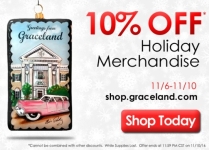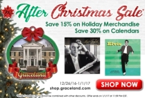 Nichts Anderes als ein ‚Rausverkauf’ von Weihnachtsartikeln mit Elvis- und Graceland-Motiven sowie von Elvis-Kalendern für das unmittelbar bevorstehende Jahr 2017 stellt das neue Sonderangebot des Shop von Elvis Presley Enterprises (EPE) dar. Noch bis zum Neujahrstag am kommenden Sonntag, dem 1. Januar 2017, offeriert das Unternehmen die Weihnachtsartikel zu einem Rabatt von 15 Prozent und die Kalender mit einem Preisnachlass von sogar 30 Prozent. Im Internet findet sich das Sonderangebot unter dem Titel „After Christmas Sale“ auf der offiziellen EPE-Shop-Seite unter www.shop.graceland.com. Datum: 28. Dezember 2016 – Quelle: Elvis Presley Enterprises (EPE) |