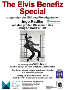 Vor sieben Jahren, im September 2009, erlebten viele Elvis-Fans eine mitreißende Konzert-Veranstaltung in Wuppertal unter dem Titel „Elvis Classic Memories“, bei der der bekannte deutsche Elvis-Interpret Eddy Ebeling alias King Eddy, seine Band „Vegas Connection“, Elvis’ Original-Pianist der 70er Jahre Glen D. Hardin als Stargast und Elvis’ Konzert-Fotograf Ed Bonja als ‚Special Guest’ den Besuchern eine tolle und abwechslungsreiche Show boten. Nach der damals von unserem Fanclub „The King’s World (TKW)“ präsentierten und mitorganisierten Veranstaltung wurde es um King Eddy eine Zeitlang ruhiger. Seit einigen Monaten jedoch ist der Westfale mit neuen Shows zur Erinnerung an Elvis wieder voll aktiv, was für uns wiederum Anlass genug ist, die seinerzeit gute und freundschaftliche Zusammenarbeit mit dem sympathischen Elvis-Interpreten wieder aufzugreifen. Erstes schönes Resultat dieser wiederaufgenommenen Kooperation wird eine gemeinsame große Elvis-Geburtstagsparty zum 82. Ehrentag des King im Januar 2017 sein. Unter dem Titel „Happy Birthday Elvis – Celebrated By King Eddy“ wird die Veranstaltung stattfinden am Samstag, dem 14. Januar 2017, um 20.00 Uhr in der beliebten Location „L. A. Diner“, einem großräumigen Lokal im US-Stil in der Hattinger Straße 13 in 58332 Schwelm, einer Nachbarstadt von Wuppertal. Geboten werden eine vielfältige mehrteilige Elvis-Tribut-Show mit King Eddy, leckere Speisen amerikanischer Art und ein gut bestückter Elvis-Fanartikel-Markt. Der Eintritt ist frei! King Eddy sowie das Team unseres Elvis-Fanclubs „The King’s World“ freuen sich bereits auf den Besuch vieler Elvis-Fans aus nah und fern! Datum: 13. Dezember 2016 – Quellen: King Eddy, L. A. Diner Schwelm |