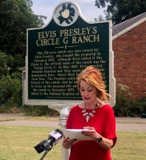 Seit vielen Jahren schon ist Elvis Presleys ehemalige „Circle G Ranch“ in Horn Lake/Mississippi verwaist und ‚gammelt’ ungenutzt vor sich hin. Alle Bemühungen von Elvis-Fans und auch die Initiativen der zur Erhaltung des Hauses gegründeten „Circle G Foundation“, das Gebäude zu restaurieren und der Öffentlichkeit zugänglich zu machen, scheiterten bislang am Desinteresse des heutigen Besitzers. Hieran änderte auch die Tatsache nichts, dass die „Circle G Ranch“, die der King von Februar 1967 bis Dezember 1972 besessen und recht oft als Rückzugs- und Spaß-Location genutzt hatte, im Jahr 2019 in das amerikanische „National Register Of Historic Places“ aufgenommen worden war. Nun ist wieder ein wenig frische Bewegung in die Sache gekommen, denn vor wenigen Tagen wurde im Rahmen einer feierlichen kleinen Zeremonie endlich auch ein „Historical Marker“ – also eine offizielle Gedenktafel – an dem Gebäude aufgestellt, die auf die historische Bedeutung der Ranch im Zusammenhang mit Elvis Presley verweist. Die Einweihungszeremonie wurde durchgeführt von Elvis’ Cousine Donna Presley (s. Foto von ihrer Ansprache an die Anwesenden) und Allen Latimer, dem Bürgermeister von Horn Lake. Treibende Kraft hinter der Aufstellung der Gedenktafel war freilich die von Lesley Pilling gegründete und geleitete „Circle G Foundation“, die sich auch weiterhin für die Erhaltung und Nutzung der Ranch als museumsähnliche Elvis-Gedenkstätte einsetzen will. Datum: 14./15. September 2021 – Quelle: The Circle G Foundation |