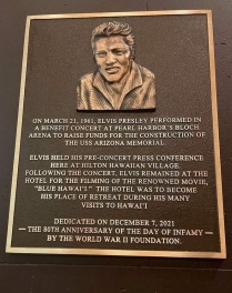 Auf Hawaii ist kürzlich eine neue Gedenktafel für den King eingeweiht worden. Die Tafel soll den großen Beitrag würdigen, den Elvis im Frühling 1961 zur Fertigstellung des „USS Arizona Memorial“ in Pearl Harbor/Hawaii geleistet hatte. Das „USS Arizona Memorial“ sollte eine Gedenkstätte für den verheerenden japanischen Luftangriff auf den amerikanischen Flottenstützpunkt Pearl Harbor werden, bei dem am 7. Dezember 1941 vor allem das Schlachtschiff „USS Arizona“ versenkt worden war und alleine dabei 1177 amerikanische Marine-Soldaten ums Leben gekommen waren. Zur Abschlussfinanzierung der Gedenkstätte hatte Elvis am 25. März 1961 ein Benefizkonzert in der „Bloch Arena“ in Pearl Harbor gegeben, bei dem über 60 000 Dollar zusammenkamen. Genau 80 Jahre nach dem Angriff der Japaner, durch den der bis dahin hauptsächlich in Europa tobende Krieg erst wirklich zum 2. Weltkrieg wurde, ist nun am „Hilton Hawaiian Village Hotel“ in Honolulu/Hawaii eine braun-goldene Tafel eingeweiht worden, die an Elvis und sein Benefizkonzert von 1961 erinnert. Das Hotel wurde deshalb als Location für die Tafel ausgewählt, weil es viele Jahre lang die bevorzugte Unterkunft des King auf Hawaii war und weil die Pressekonferenz vor dem 1961er Konzert dort stattgefunden hatte. Doch so verdient die Ehrung für Elvis auch ist, so ärgerlich ist ein vermeidbarer Schönheitsfehler im Text der Tafel, in dem das besagte Elvis-Konzert falsch auf den 21. März 1961 datiert worden ist. Die Verantwortlichen für die Gedenktafel haben allerdings schon angekündigt, dass man den peinlichen Fauxpas noch korrigieren werde… Datum: 21. Dezember 2021 – Quellen: World War II Foundation, The Elvis Travel Service |