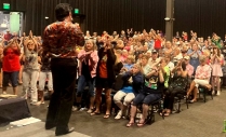 Mit einem Bus-Ausflug nach Tupelo, einer Sonderführung durch Graceland und authentischen Erinnerungen von Elvis’ Songwritern ist am Donnerstag und Freitag, dem 11. und 12. August 2022, die „Elvis Week 45 – 2022“ von Elvis Presley Enterprises (EPE) zum 45. Todestag des King in Memphis fortgesetzt worden. Der ausverkaufte Bus-Ausflug mit dem EPE-eigenen Luxus-Reisebus „Graceland Excursions“ führte mit „Elvis Week“-Moderator Tom Brown in Elvis Presleys Geburtsstadt Tupelo/Mississippi (etwa zwei Autostunden von Memphis entfernt), wo die Teilnehmer vor allem natürlich Elvis’ historisches Geburtshaus und das dortige Museum aber auch andere historische Stätten der frühen Elvis-Geschichte wie den „Tupelo Hardware Store“ besuchten. Ebenfalls restlos ausgebucht war die Sonderführung „Hidden Graceland Tour“ durch das Anwesen des King, bei der EPE-Archiv-Leiterin Angie Marchese (oberes Foto ganz links mit Fans) und wiederum Tom Brown als ganz spezielle persönliche Besucherführer agierten und den Teilnehmern natürlich besonders sachkundige Erklärungen zur Inneneinrichtung der Villa und zu den unzähligen zu sehenden Artefakten geben konnten. Fans, die sehr detailliert an der Musik des King und ihren Hintergründen interessiert sind, kamen indes bei der ersten Gesprächsveranstaltung der diesjährigen „Elvis Week“ auf ihre Kosten. Unter dem Titel „Elvis Songwriters Showcase“ berichteten im Theatersaal des EPE-Hotels „The Guest House At Graceland“ die originalen Elvis-Songwriter Mike Stoller und Dickey Lee sowie der erstmals überhaupt bei der Gedenkwoche zu Gast seiende einst sehr erfolgreiche Sänger und Songwriter Billy Swan (Autor und Original-Interpret von „I Can Help“) über ihre Arbeit für den King und ihre Begegnungen mit ihm. Dass bei der Veranstaltung nicht nur gesprochen sondern auch musiziert wurde, lag vor allem an Dickey Lee, der es sich trotz seiner fast 86 Jahre nicht nehmen ließ, u. a. sein „She Thinks I Still Care“ großartig live vorzutragen (unteres Foto)! An diesem Wochenende wird die „Elvis Week 45 – 2022“ mit weiteren vielfältigen Einzelveranstaltungen fortgeführt werden und dabei allmählich ihrem Höhepunkt mit Elvis’ 45. Todestag in der nächsten Woche zusteuern. Datum: 12./13. August 2022 – Quellen: Elvis Presley Enterprises (EPE), Angie Marchese |