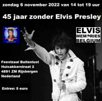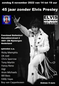 Wie angekündigt findet am heutigen Sonntag in Rijsbergen in den Niederlanden (nahe Breda gelegen, der Geburtsstadt von Elvis’ Manager Tom Parker) das internationale Event „45 Jaar zonder Elvis Presley“ statt. Die Veranstaltung ist ein Gemeinschaftsprojekt des belgisch-niederländischen Fanclubs „Elvis Memories Belgium“ und unseres deutschen Fanclubs „The King’s World (TKW)“, die damit ihre langjährige vertrauensvolle und erfolgreiche Partnerschaft fortsetzen. Das Event versteht sich als nochmalige europäische Würdigung des King zu dessen 45. Todestag. Das Programm besteht aus Live-Auftritten diverser bekannter Elvis-Interpreten, einer Elvis-Tombola und einer großen Elvis-Fanartikel-Börse. Ort des Geschehens ist der bewährte „Feestzaal Buitenlust“, wo „45 Jaar zonder Elvis Presley“ um 14.00 Uhr beginnt und bis in die Abendstunden dauert. Der Eintritt kostet nur 5,- Euro, und die Veranstaltung kann ohne jegliche Einschränkungen oder Voraussetzungen frei besucht werden. Weitere Informationen zu dem Ereignis finden sich hier auf unserer TKW-Internetseite unter der Rubrik „Elvis-Events“, s. hier. Unser Team freut sich bereits sehr auf die Wiederbegegnung mit vielen Elvis-Fans aus dem gesamten mitteleuropäischen Raum! Datum: 6. November 2022 – Quellen: TKW-Event-Team, Fanclub „Elvis Memories Belgium“ |
