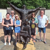 Ein Bus-Ausflug in Elvis Presleys Geburtsstadt Tupelo/Mississippi und weitere vielfältige Aktivitäten wurden den bereits sehr zahlreich in Memphis weilenden Fans am gestrigen zweiten Tag der „Elvis Week“ von Elvis Presley Enterprises (EPE) zum 46. Todestag des King geboten. Der Bus-Ausflug ins etwa zwei Autostunden von Memphis entfernte Tupelo gab den Teilnehmern die Gelegenheit, das historische Geburtshaus von Elvis, das dortige Museum und weitere geschichtsträchtige Plätze der Presley-Historie zu besichtigen (Foto: Mitglieder unseres belgischen Partner-Fanclubs „Elvis Memories Belgium“ an der Elvis-Doppelstatue oberhalb des Geburtshauses). Es folgte die zweite Sonderführung „Hidden Graceland Tour“ durch das Anwesen des King mit EPE-Archiv-Leiterin Angie Marchese als spezieller Besucherführerin, ehe das Halbfinale des diesjährigen großen Elvis-Imitatoren-Wettbewerbs „The Ultimate Elvis Tribute Artist Contest“ im Veranstaltungsgebäude „Graceland Soundstage“ den abwechslungsreichen Tag in der Heimatstadt unseres Idols beschloss. Datum: 11. August 2023 – Quellen: Elvis Presley Enterprises (EPE), Frans Michielsen/Fanclub „Elvis Memories Belgium“ |