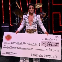 Bei der laufenden „Elvis Week“ in Memphis zum kurz bevorstehenden 46. Todestag des King hat der Amerikaner Cote Deonath den traditionellen „Ultimate Elvis Tribute Artist Contest“ gewonnen. Beim wie jedes Jahr hart umkämpften Finale auf der „Graceland Soundstage“ setzte sich der Mann aus Ocala/Florida vor seinen Landsleuten Jimmy Holmes aus DeMotte/Indiana und Moses Snow aus Decatur/Texas durch. Bei der anschließenden Siegerehrung zeigte sich Cote Deonath beinahe sprachlos über den bis dahin größten Erfolg seiner Elvis-Darsteller-Karriere und posierte fast noch ungläubig lächelnd mit dem symbolischen Scheck über die Siegprämie von 20 000,- US-Dollar (s. Foto). Unter den Fans des King ist der „Ultimate Elvis Tribute Artist Contest“ als regelmäßiger fester Bestandteil der „Elvis Week“ umstritten. Einerseits lehnen besonders die Puristen unter den Elvis-Anhängern den Contest als unwürdigen Zirkus ab, doch andererseits ist das Finale in Memphis alljährlich ausverkauft und findet stets große Beachtung speziell in der amerikanischen Elvis-Szene. Datum: 13. August 2023 – Quellen: Elvis Presley Enterprises (EPE), Cote Deonath |
