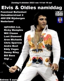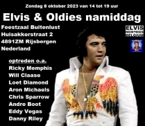 Wie angekündigt findet am heutigen zweiten Oktober-Sonntag das nächste große Event in Erinnerung an Elvis Presley mit unserem Fanclub „The King’s World (TKW)“ statt. In enger Zusammenarbeit mit unserem belgisch-niederländischen Partner-Club „Elvis Memories Belgium“ präsentieren wir die nächste Ausgabe der beliebten Veranstaltungsreihe „Elvis & Oldies Namiddag“ in der Stadt Rijsbergen in den Niederlanden (nahe Breda gelegen). Das Programm besteht aus Live-Auftritten bekannter Elvis-Interpreten aus den Benelux-Ländern, einer Elvis-Tombola mit wertvollen Preisen und einem großen Elvis-Fanartikel-Markt. Ort des Geschehens ist der bewährte „Feestzaal Buitenlust“ in der Huisakkerstraat 2 in 4891 Rijsbergen/Niederlande, wo die Veranstaltung heute Nachmittag um 14.00 Uhr beginnt und bis in die frühen Abendstunden dauert. Der Eintritt beträgt lediglich 5,- Euro. Die Fanclubs „Elvis Memories Belgium“ und „The King’s World“ freuen sich auf den Besuch vieler Fans aus den Niederlanden, aus Belgien und aus dem nicht weit entfernten Deutschland beim heutigen „Elvis & Oldies Namiddag“! Datum: 8. Oktober 2023 – Quellen: Fanclub „Elvis Memories Belgium“, TKW-Event-Team |