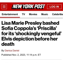 Zu Beginn dieses Monats November 2023 ist der neue biografische Spielfilm „Priscilla“ in Nordamerika (USA und Kanada) in den Kinos angelaufen. Der von Sofia Coppola für die amerikanische Filmgesellschaft „A24“ produzierte und inszenierte Film (oberes Szenenfoto) erzählt die Liebesgeschichte zwischen Elvis Presley und seiner späteren Ehefrau Priscilla Beaulieu vom ersten Kennenlernen im Jahr 1959 bis zur Trennung im Jahr 1973 aus der subjektiven Sicht von Priscilla, die als Co-Produzentin fungierte. Die Handlung basiert auf ihrem umstrittenen Bestseller-Buch „Elvis And Me“ aus dem Jahr 1985 und ist dessen bereits zweite Verfilmung. Sofia Coppolas „Priscilla“ besitzt eine Länge von 1 Stunde und 53 Minuten und präsentiert die Amerikanerin Cailee Spaeny in der Rolle von Priscilla und den Australier Jacob Elordi in der von Elvis. Nachdem die Plattenfirma „Sony Music“ keine entsprechenden Lizenzen erteilt hatte, enthält der Film keinerlei Songs des King. In den USA hielt sich der Publikumszuspruch zu „Priscilla“ bislang offenbar in Grenzen. Wie mehrere amerikanische Fans berichteten und auch mit Fotos nachwiesen, blieben in etlichen Kinos sehr viele Plätze unbesetzt. Die Meinungen derjenigen Besucher, die den Film gesehen haben, gehen über den Streifen auseinander. Während die Einen „Priscilla“ als durchaus romantische Darstellung empfunden haben, verurteilten die Anderen die Film-Biografie als Horrorgemälde des King, das genüsslich die fragwürdigen Schilderungen aus Priscillas Buch ausmalt. Höchst interessant ist in diesem Zusammenhang ein Vorgang, der erst jetzt ans Tageslicht gekommen ist: Vor ihrem Tod hatte Elvis’ Tochter Lisa Marie Presley das Drehbuch des Films gelesen und sich darüber schockiert und empört gezeigt. Lisa hatte dann die Produzentin und Regisseurin Sofia Coppola kontaktiert und eine Änderung des Drehbuches gefordert. Wörtlich soll Elvis’ Tochter dabei gesagt haben: „Mein Vater kommt nur manipulativ und als Raubtier rüber. Ich sehe in der Figur nichts von meinem Vater. Ich sehe nur Eure schockierend rachsüchtige und verächtliche Perspektive und verstehe nicht, warum?“ (untere Abbildung eines Internet-Artikels der amerikanischen Tageszeitung „New York Post“). Hierauf soll das Script geringfügig gekürzt aber nicht substantiell geändert worden sein. Bis auch die deutschen Fans und unser Fanclub „The King’s World“ sich zu alledem ein abschließendes Urteil bilden können, wird leider noch etwas Zeit vergehen. Im deutschsprachigen Raum wird Sofia Coppolas „Priscilla“ anders als wohl ursprünglich geplant erst am 4. Januar 2024 in die Kinos kommen. Datum: 7./8. November 2023 – Quellen: A24, New York Post, Magazin „Variety“, Filmstarts, diverse |