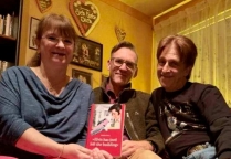 Bereits Ende Juli 2023 ist im Buchhandel des deutschsprachigen Raumes ein neuer Roman erschienen, bei dem es um einen Elvis Presley geht, der weder richtig tot noch wirklich lebendig ist. Das Buch trägt hierzu sehr passender Weise den Titel „Elvis Has (Not) Left The Building“ (obere Cover-Abbildung) und ist geschrieben worden von Mathias Dorn (mittleres Foto), einem 56-jährigen Simultan-Dolmetscher und großem Elvis-Fan, der mit dem Roman sein Erstlingswerk als Autor vorgelegt hat. Die Geschichte in „Elvis Has (Not) Left The Building“ spielt im August 2017 während der „Elvis Week“ in Memphis zum damaligen 40. Todestag des King. Im Mittelpunkt der Story steht ein Dolmetscher aus Deutschland, der einst in der Schule wegen seines verwegenen Outfits den Spitznamen ‚Marshal’ verpasst bekommen hat und während der gesamten Handlung stets nur unter diesem in Erscheinung tritt. Dem aufmerksamen Leser wird von Anfang an bewusst, dass diese Figur des ‚Marshal’ starke autobiografische Züge des Buch-Autors Mathias Dorn trägt. Nicht autobiografisch ist dabei, dass der ‚Marshal’ ein heftiges Alkoholproblem hat, welches ihm bei dem vielleicht ehrenvollsten Auftrag seiner Dolmetscher-Karriere zum Verhängnis wird: Bei der „Elvis Week“ nämlich soll der (fiktive) deutsche „Elvis-Presley-Club (EPC)“ in Memphis Elvis’ historischen pinkfarbenen 1955er Cadillac aus dem Graceland-Archiv als Leihgabe zu Ausstellungszwecken in Deutschland übernehmen und hat für die feierliche Übergabe-Zeremonie den ‚Marshal’ als Übersetzer gebucht. Dieser jedoch vermasselt in angetrunkenem Zustand den Auftrag komplett, was darin gipfelt, dass er vor den versammelten Fans, Prominenten und Medien-Vertretern spektakulär zusammenbricht. Seinen Frust ertränkt der ‚Marshal’ bei einer nächtlichen Sauf-Tour durch Memphis zusammen mit seiner neuen Zufallsbekanntschaft, dem Deutsch-Iren Liam, der ebenfalls noch aus der Schulzeit den Spitznamen ‚Der Irre’ trägt in Anspielung auf den irischen Teil seiner Herkunft und auf seine Elvis-Verrücktheit. Auf dem Rückweg ins Hotel dringen der ‚Marshal’ und der ‚Irre’ ungehindert ins nächtliche Graceland ein, wo sie glauben, einen Lichtschein gesehen zu haben. Und dort, zwischen Esszimmer und Hausflur, begegnen sie schließlich niemand Geringerem als… Elvis Presley höchst selbst! Dieser Elvis ist am 16. August 1977 irgendwie doch nicht richtig gestorben, aber wirklich lebendig ist er auch nicht. Elvis scheint in einer Zwischendimension zwischen Leben und Tod gefangen zu sein, die er sich selbst nicht recht erklären kann. Er besitzt dabei eine Reihe von übermenschlichen Fähigkeiten: Elvis kann bei seinem Äußeren offenbar beliebig zwischen den 60er und 70er Jahren hin und her wechseln. Er kann Entfernungen jeder Art in Sekundenschnelle überwinden. Er ist für normale lebende Menschen üblicherweise unsichtbar, kann sich aber genauso auch sichtbar machen, wenn er dies möchte. Unmöglich ist es ihm freilich, mit anderen Verstorbenen in Kontakt zu treten, da er sich eben (noch) nicht in deren Dimension befindet. Und Elvis hat alle Geschehnisse während der 40 Jahre seit seinem nur relativen Ableben sehr aufmerksam verfolgt, wobei er auch intensiv über sich selbst und sein Leben bis 1977 nachgedacht hat. In den folgenden drei Tagen verbringen der ‚Marshal’ und der ‚Irre’ viel Zeit mit dem untoten Elvis in Graceland, wobei sie sich während ihres Aufenthaltes anscheinend in dessen Dimension befinden und für normale Menschen während des Trubels der fortschreitenden „Elvis Week“ ebenfalls unsichtbar sind. Schließlich hat der King einen Auftrag für die mittlerweile zu Freunden gewordenen Männer, der aber durch eine Verkettung unglücklicher Umstände fast in ein tödliches Drama mündet… Mit seinem Roman „Elvis Has (Not) Left The Building“ hat Mathias Dorn (auf unterem Foto beim Treffen mit Peter und Sandra Beines von „The King’s World“) ein außergewöhnliches Werk rund um das Thema Elvis Presley vorgelegt. Obwohl Dorn zuvor über keinerlei schriftstellerische Erfahrung verfügte, ist schon sein Erzählstil von einer flüssigen und bildhaften Sprache sowie einem guten dramaturgischen Gefühl geprägt. Inhaltlich verrät seine Erzählung – neben einer erfrischend blühenden Fantasie – eine hohe Kompetenz betreffend das Leben, die Karriere und das Wirken von Elvis Presley. Fachlich unterläuft Dorn nur ein einziger nennenswerter Fehler, indem in seinem Memphis des August 2017 immer noch die alte „Elvis Presley Plaza“ existiert, die da aber schon durch den neuen Komplex „Elvis Presley’s Memphis“ ersetzt worden war. Angenehm erscheint wiederum, dass der Autor bei der Schilderung, wie Elvis reflektierend über sein Leben nachdenkt, nicht den Fehler macht, viel zu weit zu gehen. Mathias Dorn legt dem King nie Worte in den Mund, die dieser im Jahr 2017 möglicherweise nicht gesagt hätte. Und so stellt „Elvis Has (Not) Left The Building“ zumindest für Menschen, die ein wenig Sinn für Fantasie besitzen, einen höchst lesenswerten Stoff dar. Elvis-Fans werden in der Story den King wiederfinden, den sie alle so lieben. Nicht-Fans wiederum können viel über den Künstler UND den Menschen Elvis Presley erfahren. Allgemein betrachtet präsentiert sich der Roman vornehmlich als eine gefühlvolle Fantasy-Geschichte für Elvis-Interessierte, die aber auch sehr erheiternde komödiantische Passagen enthält und am Ende vorübergehend sogar zum Krimi gerät. „Elvis Has (Not) Left The Building“ ist als Taschenbuch mit einem Umfang von 248 Seiten publiziert worden vom Verlag „Books on Demand“ mit Sitz in Norderstedt bei Hamburg. Die ISBN-Nummer des deutschen Buchhandels lautet 13:978-3757826673. Der Roman ist überall im Buchhandel zum Preis von 11,99 Euro erhältlich. Datum: 26./27. November 2023 – Quellen: Mathias Dorn, Books on Demand GmbH |