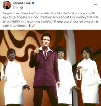 Beim weltweiten Internet-Streaming-Portal „Netflix“ wird in diesem Jahr 2024 offenbar eine neue Dokumentar-Serie über Elvis Presley gezeigt werden. Hierbei erstaunt die Art und Weise, wie dies bekannt gegeben worden ist, schon ziemlich. Noch bevor es nämlich irgendeine genauere Information über dieses Projekt von „Netflix“ selbst oder beispielsweise von einer Institution wie Elvis Presley Enterprises (EPE) gegeben hat, hat die amerikanische frühere Elvis-Begleitsängerin Darlene Love fast beiläufig auf ihrem Account beim sozialen Netzwerk „Facebook“ die in Vorbereitung befindliche Serie erwähnt und stolz darauf hingewiesen, dass sie selbst in der anscheinend mehrteiligen Dokumentation in Erscheinung treten wird. Laut dem Posting der immer noch aktiven Sängerin soll Elvis-Ex-Frau Priscilla Beaulieu in die kommende Dokumentation involviert sein. Darlene Love ist Elvis-Fans bekannt als Mitglied des dunkelhäutigen weiblichen Chores „The Blossoms“, der 1968 in Elvis’ Comeback-TV-Special als Vokal-Begleitung des King in der Gospel-Sequenz zu erleben war. Sobald wir mehr über das genannte Projekt wissen, werden wir hier in unseren Elvis-News darüber berichten. Datum: 28. März 2024 – Quelle: Facebook/Darlene Love |