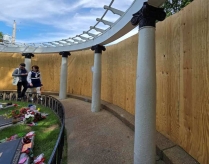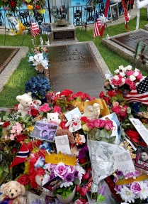 Im „Meditation Garden“ von Elvis Presleys Villa Graceland in Memphis finden zurzeit Renovierungsarbeiten statt. Die Arbeiten betreffen die Mauer, die sich halbkreisförmig um die Gräber von Elvis, seinen Eltern Vernon und Gladys sowie von Großmutter Minnie Mae bildet. Gegenwärtig befinden sich große Holzplatten vor der Mauer (s. Foto), so dass für die Besucher des Anwesens und der Grabstätten nicht erkennbar ist, was genau dort im Moment gemacht wird. Etwas seltsam erscheint bei alledem, dass Elvis Presley Enterprises (EPE) keinerlei Information zu den Arbeiten verbreitet hat. Erfahren hat die Redaktion unseres Fanclubs „The King’s World“ von dem Vorgang nur durch Infos, die wir dankenswerter Weise von amerikanischen Freunden direkt aus Memphis erhalten haben. Datum: 1./2. Juli 2024 – Quelle: Sandy Laughlin Murdock |