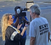Bei der „Elvis Week“ von Elvis Presley Enterprises (EPE) in Memphis zum anstehenden 47. Todestag des King (oberes Foto des Fan-Begrüßungsbanners) hat es gleich am ersten Tag ein vielfältiges Programm gegeben. Den Auftakt der weltgrößten Elvis-Gedenkveranstaltung bildete am gestrigen Freitagmorgen, dem 9. August 2024, ein Bus-Ausflug in Elvis’ Geburtsstadt Tupelo/Mississippi mit Besuch des dortigen Geburtshauses unseres Idols sowie des zugehörigen Museums. Am frühen Abend folgte die erste von drei Sonderführungen durch Elvis’ Villa Graceland mit Elvis’ ehemaliger Lebensgefährtin Linda Thompson als spezieller Besucherführerin, ehe im Veranstaltungsgebäude „Graceland Soundstage“ auf dem Gelände „Elvis Presley’s Memphis“ gegenüber von Graceland das Imitatoren-Konzert „An Ultimate Tribute: Salute To The 50s“ die legendären Auftritte des jungen Elvis in den 50er Jahren würdigte. Wie so oft vor Ort dabei ist unser langjähriger Freund und Kollege Sylvain Vertez von unserem belgisch-niederländischen Partner-Fanclub „Elvis Memories Belgium“. Sylvains erneuter Memphis-Trip weckte sogar die Aufmerksamkeit des örtlichen Fernsehsenders „Fox 13 Memphis“, der direkt am „Music Gate“ der Elvis-Villa ein Interview mit dem Belgier führte (unteres Foto) und später auch sendete. Glückwunsch, lieber Sylvain! Datum: 10. August 2024 – Quellen: Elvis Presley Enterprises (EPE), Sylvain Vertez, Fox 13 Memphis |