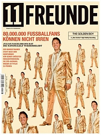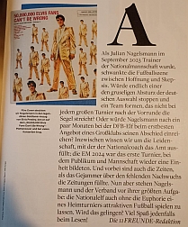 Etliche Male bereits haben wir hier in unseren Elvis-News über Begegnungen mit dem King in Bereichen berichtet, in denen man normalerweise niemals mit irgendwelchen Verweisen auf Elvis, mit Anspielungen auf ihn oder mit etwas Ähnlichem rechnet. Auffällig ist, dass solche unerwarteten Elvis-Begegnungen recht häufig im Sport und dabei immer wieder mal im Fußball vorkommen. Ein weiterer Fall dieser Art hat sich nun auf dem deutschen Zeitschriftenmarkt ereignet, und diesmal ist der Verweis auf unser Idol besonders deutlich. Das monatlich erscheinende deutsche Fußball-Fachmagazin „11 Freunde“ zeigt nämlich auf der Vorderseite seiner Ausgabe 283 für den Monat Juni 2025 eine Adaption des Covers der historischen LP „50,000,000 Elvis Fans Can’t Be Wrong – Elvis’ Gold Records, Volume 2“ vom Dezember 1959 (obere Abbildung). Hierbei hat die Redaktion des Magazins den Kopf des King gegen den des Trainers der deutschen Fußball-Nationalmannschaft Julian Nagelsmann ausgetauscht. Direkt darunter steht in Abwandlung des Elvis-Album-Titels geschrieben „80.000.000 Fußballfans können nicht irren – Julian Nagelsmann hat die Nationalelf wiederbelebt“. Im Heft selbst trägt die Titel-Geschichte über den deutschen Bundestrainer dann noch die Überschrift „Can’t Help Falling in Love. Warum man gar nicht anders kann, als die Nationalelf unter Julian Nagelsmann wieder zu lieben“. Das Beste an alledem ist aber die Tatsache, dass die Redakteure von „11 Freunde“ keinerlei Geheimnis daraus machen, woher ihre Inspiration für die außergewöhnliche Gestaltung der Titelseite des Heftes stammt: Gleich im Editorial auf Seite 3 des Magazins wird das originale Elvis-LP-Cover von 1959 gezeigt und dazu historisch korrekt geschildert, was es mit dem Album und mit dem von Elvis auf dem Cover-Foto getragenen „Gold Lamé Suit“ auf sich hat (untere Abbildung). Ob Julian Nagelsmann tatsächlich zum ‚Retter’ der deutschen Fußball-Nationalmannschaft werden wird, die vor seiner Amtsübernahme jahrelang kaum noch zweitklassiges Niveau besaß, bleibt abzuwarten. Nach der hübschen Story in „11 Freunde“ sollte der „Deutsche Fußballbund (DFB)“ es vielleicht mal mit mehr Elvis-Musik im Stadion oder im Mannschaftsbus versuchen. England und „You’ll Never Walk Alone“ lassen grüßen! Datum: 3./4. Juni 2025 – Quelle: Magazin „11 Freunde“ (Ausgabe 283/Juni 2025) |