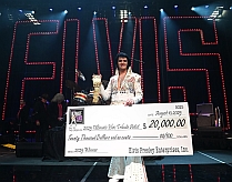 Der amerikanische Elvis-Imitator Jimmy Holmes aus DeMotte/Indiana hat am gestrigen dritten Tag der „Elvis Week“ in Memphis zum 48. Todestag des King den „Ultimate Elvis Tribute Artist Contest“ gewonnen. Im hart umkämpften Finale auf der „Graceland Soundstage“ siegte Holmes vor Louis Brown aus Goole/Großbritannien und Moses Snow aus Haslet/Texas, der als jüngster der insgesamt zehn Finalisten in dem alljährlich während der „Elvis Week“ stattfindenden großen Elvis-Darsteller-Wettstreit stand. Jimmy Holmes hatte sich als Sieger des Vorrundenwettbewerbs beim „Branson Elvis Festival“ in Branson/Missouri für die Endrunde in Memphis qualifiziert. Bei der Siegerehrung auf der „Graceland Soundstage“ präsentierte sich Holmes sichtlich stolz mit dem Championship-Gürtel und einem symbolischen Check über die Siegprämie von 20 000,- Dollar (s. Foto). Datum: 11. August 2025 – Quelle: Elvis Presley Enterprises (EPE) |