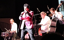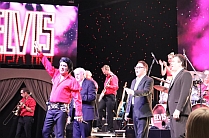 Mit großartigen Erlebnissen und wundervollen Eindrücken im Gepäck ist das Event-Team unseres Fanclubs „The King’s World (TKW)“ aus der deutschen Bundeshauptstadt Berlin an unseren Club-Sitz in Bonn zurückgekehrt. In der Millionenmetropole an der Spree nahmen wir mehrere Tage lang als offizieller Partner an der diesjährigen Spielzeit von „Elvis – Das Musical“ im „Hotel Estrel“ teil. Die Produktion des deutschen Unternehmens „Stars In Concert“ gastiert nun schon seit vielen, vielen Jahren jeden Sommer anlässlich des Todestages von Elvis Presley in dem renommierten Hotel-, Kongress- und Entertainment-Komplex im Berliner Stadtteil Neukölln, und so stellt sich die Frage, ob die Aufführung nach so langer Zeit immer noch zu begeistern vermag und einem würdigen Andenken an Elvis gerecht wird. Unsere eindeutige Antwort auf diese Frage lautet: Ja, das tut sie! Das Konzept von „Elvis – Das Musical“, das Live-Geschehen auf der Bühne mit Video-Einspielungen von Archiv-Material aus dem Leben und der Karriere des King zu verknüpfen, fasziniert nach wie vor. Dies liegt nicht zuletzt daran, dass „Stars In Concert“ Inhalt und Qualität der Einspielungen sowie deren Präsentation – gegenwärtig kommen hierfür nicht weniger als fünf (!) Videowände zum Einsatz – über die Jahre hinweg stets verfeinert und verbessert hat. Das Wichtigste an einem Elvis-Musical ist aber natürlich der Elvis-Darsteller, und hier verfügen die Verantwortlichen mit dem irisch-kanadischen Sänger und Schauspieler Grahame Patrick ohne jede Frage über eine Idealbesetzung. Patrick besitzt nicht nur eine beeindruckende Elvis-ähnliche Stimme und die Fähigkeit, die Gestik und Mimik unseres Idols perfekt nachzuahmen, sondern gehört auch zu den ganz wenigen Elvis-Darstellern der Welt, die den jungen Elvis genauso überzeugend verkörpern wie den älteren. „Elvis – Das Musical“ beginnt mit Video-Einspielungen internationaler Fernsehmeldungen von Elvis’ Tod am 16. August 1977 und der Live-Darbietung des Songs „My Way“. Hiernach geht der Blick zurück in die Jahre 1953/54, in denen Elvis Presleys Musik-Karriere bei „Sun Records“ startete, um anschließend die Zeit, in der der junge Nachwuchssänger zum König des Rock’n’Roll aufstieg, dynamisch darzustellen (oberes Foto). Beschlossen wird der 1. Akt mit einer temporeichen Revue des Film-Elvis der 60er Jahre, bei der auch die beiden attraktiven Tänzerinnen der Besetzung charmant zur Geltung kommen (zweites Foto). Der 2. Akt beginnt mit einer überaus gekonnten Zusammenfassung der Comeback-Fernseh-Show von Elvis im Jahr 1968, ehe ein typisches Elvis-Konzert der glitzernden 70er Jahre an den Ausgangspunkt der Darbietung zurückführt (drittes Foto). So wichtig die Performance von Grahame Patrick in jeder Phase der Aufführung naturgemäß ist, so sehr überzeugen auch die anderen Mitwirkenden. Die Big Band unter der virtuosen Leitung des Keyboarders und Arrangeurs Robin Scott (viertes Foto) beherrscht den eher schlichten Rock’n’Roll-Sound der 50er Jahre ebenso stilecht wie den Rock- und Pop-Bombast des King in den 70er Jahren. Besonders berührend ist natürlich die Mitwirkung von Elvis’ originalem Begleitsänger der 70er Jahre Ed Enoch und der heutigen Besetzung seines Elvis-Gospel-Chores „The Stamps Quartet“ (fünftes Foto). Im Alter von 81 Jahren zeigt Enoch immer noch so eine Musikalität und Vitalität, dass man seinen Ohren und Augen kaum traut. Der ehrwürdige Veteran aus Nashville erweist sich damit als unermüdlicher Botschafter der einzigartigen Kunst des King. Einen nicht musikalischen aber dennoch extrem wertvollen Beitrag zum Gelingen der Darbietung leistet schließlich der Schauspieler Daniel Neumann-Schwarz in einer Doppelrolle als Elvis’ erster Produzent Sam Phillips und als Elvis’ berühmt-berüchtigter Manager ‚Colonel’ Tom Parker. Neumann-Schwarz bewältigt dabei die schmale Gratwanderung zwischen seriöser Darstellung und unterhaltsamer Parodie mit bemerkenswerter Bravour (unteres Foto). Belohnt wurden die rund zweistündigen Aufführungen in Berlin an allen Abenden, an denen unser TKW-Team vor Ort war, durch einen gut gefüllten Saal und begeisterte Reaktionen der Besucher. Auch der Fanclub-Stand von „The King’s World“ erweckte viel Aufmerksamkeit, so dass alle Anwesenden eine richtig gute Zeit in Erinnerung an Elvis Presley verbringen konnten. Herzlich danken möchten wir allen Verantwortlichen des „Hotel Estrel“ und von „Stars In Concert“ für die auch in diesem Jahr wieder sehr angenehme Zusammenarbeit. „Elvis – Das Musical“ gastiert jetzt noch bis zum 28. September 2025 im „Hotel Estrel“. Alle Infos zu Terminen, Location und Ticket-Erwerb finden Sie in unserer Rubrik „Elvis-Events“. Elvis, das Hotel und das Musical sind auch im Jahr 2025 eine Reise nach Berlin mehr als wert! Datum: 25. August 2025 – Quellen: TKW-Event-Team, Stars In Concert, Hotel Estrel Berlin |